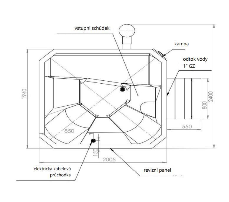 • vana je pro 5 osob. Rozložení vnitřní části: 4 sedátka a 1 lehátko + vnitřní schůdek